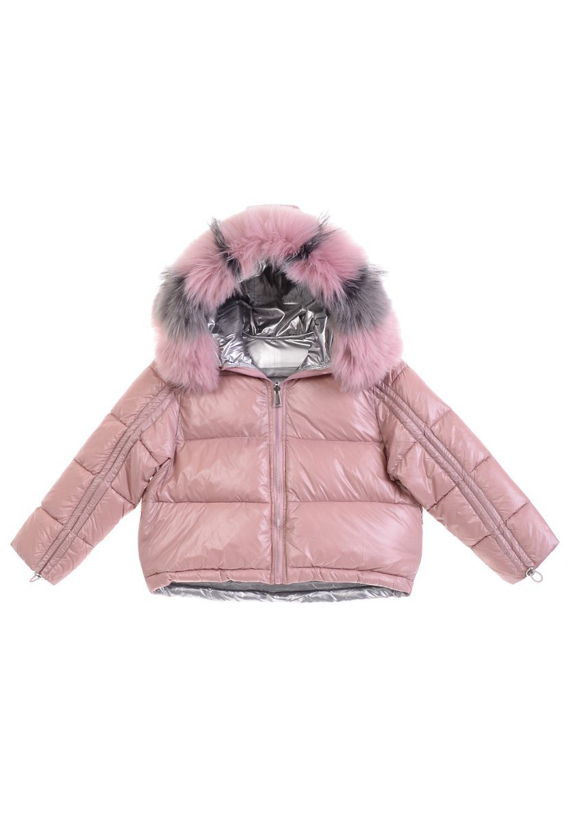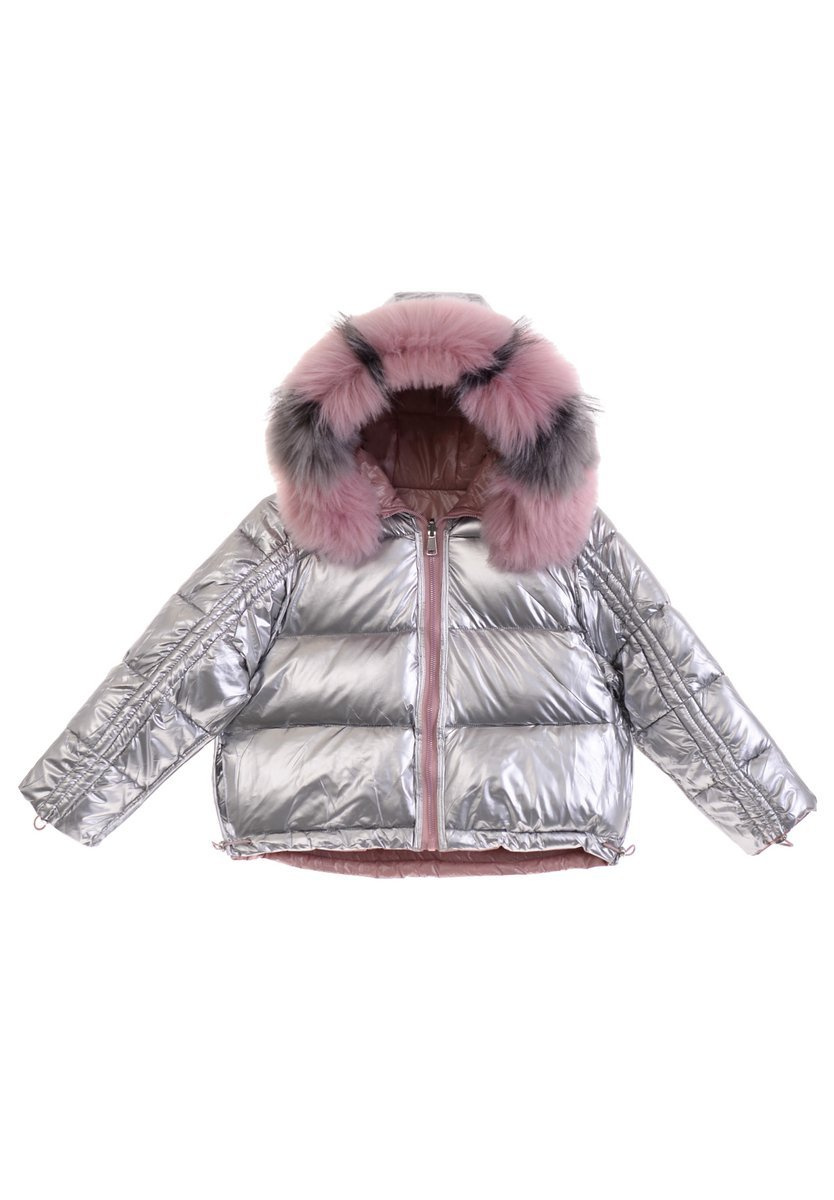 Dziecięca dwustronna kurtka to doskonały wybór dla dziewczynek. Z jednej strony prezentuje się w odcieniu różowym, natomiast z drugiej strony w kolorze srebrnym. Kurtka jest wypełniona ociepleniem nie tylko na całej długości, ale też w rękawach. Posiada także kaptur z kolorowym futerkiem, które można swobodnie odpinać. W rękawach znajdują się także wygodne ściągacze, umożliwiające dokładne dopasowanie, a z przodu dwie kieszenie zapinane na poręczne suwaki. Kurtka uszyta została z najwyższą dbałością o szczegóły, dzięki czemu gwarantuje wysoki poziom ciepła i izolacji od warunków atmosferycznych.