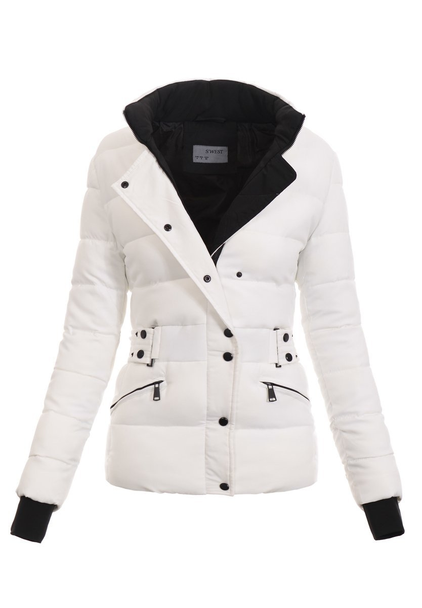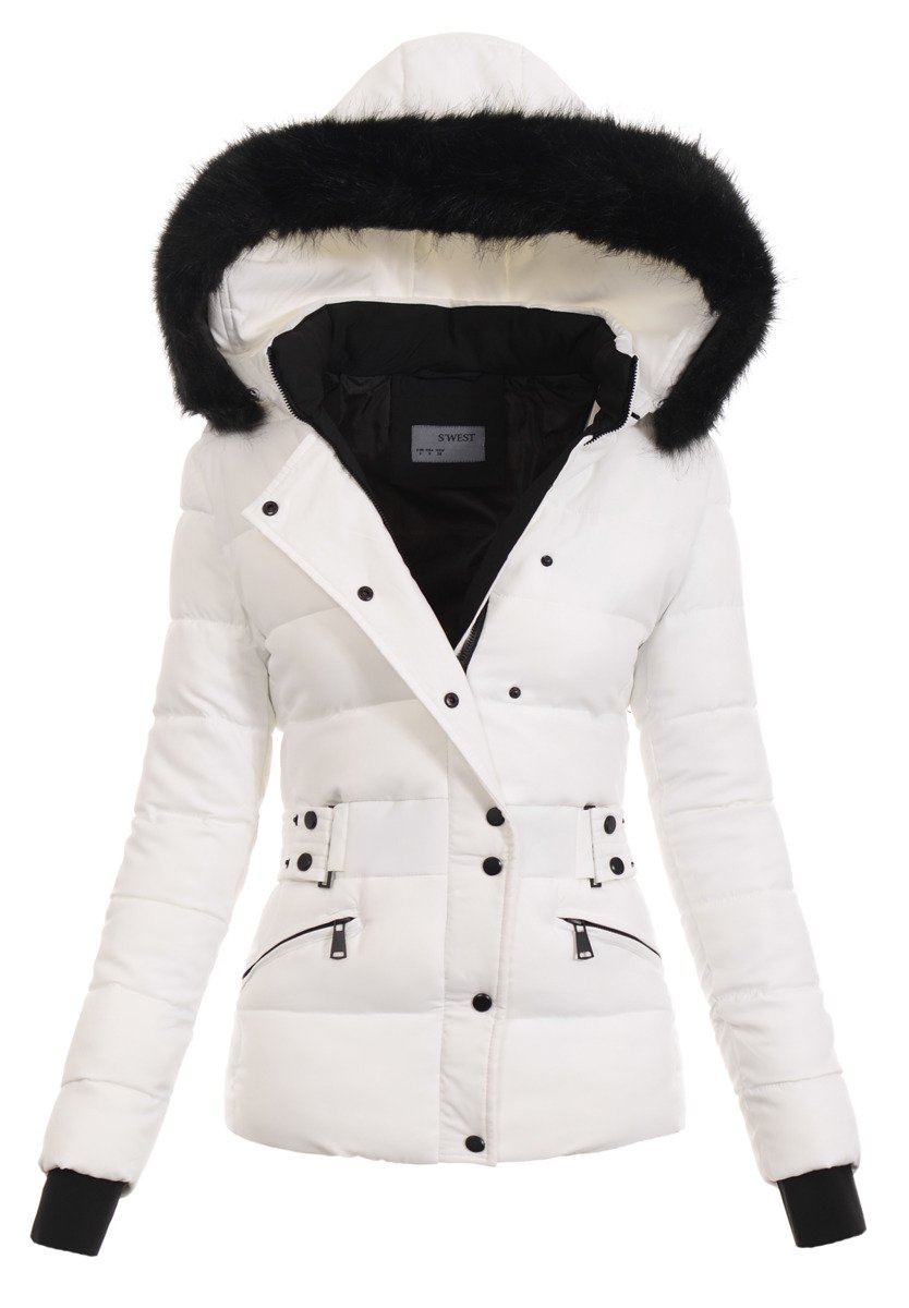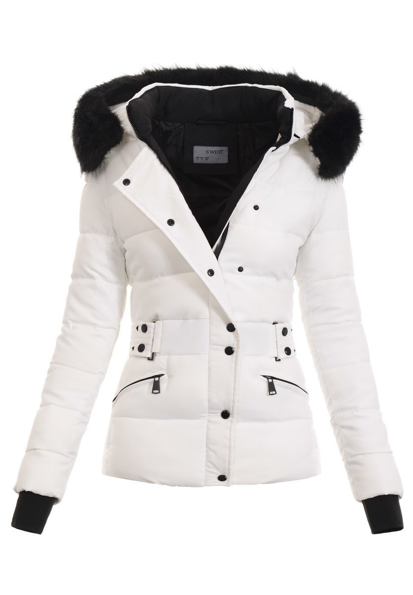 Rewelacyjna damska kurtka. Kolor biały. Zapinana na suwak i napy. Odpinany kaptur z odpinanym futerkiem. Kurtka posiada ozdobny pasek. Dwie kieszenie z przodu zapinane na suwak. Ściągacz na dole. Długość mankietu w rękawie ok 12 cm. Materiał wierzchni: 100% Poliester.