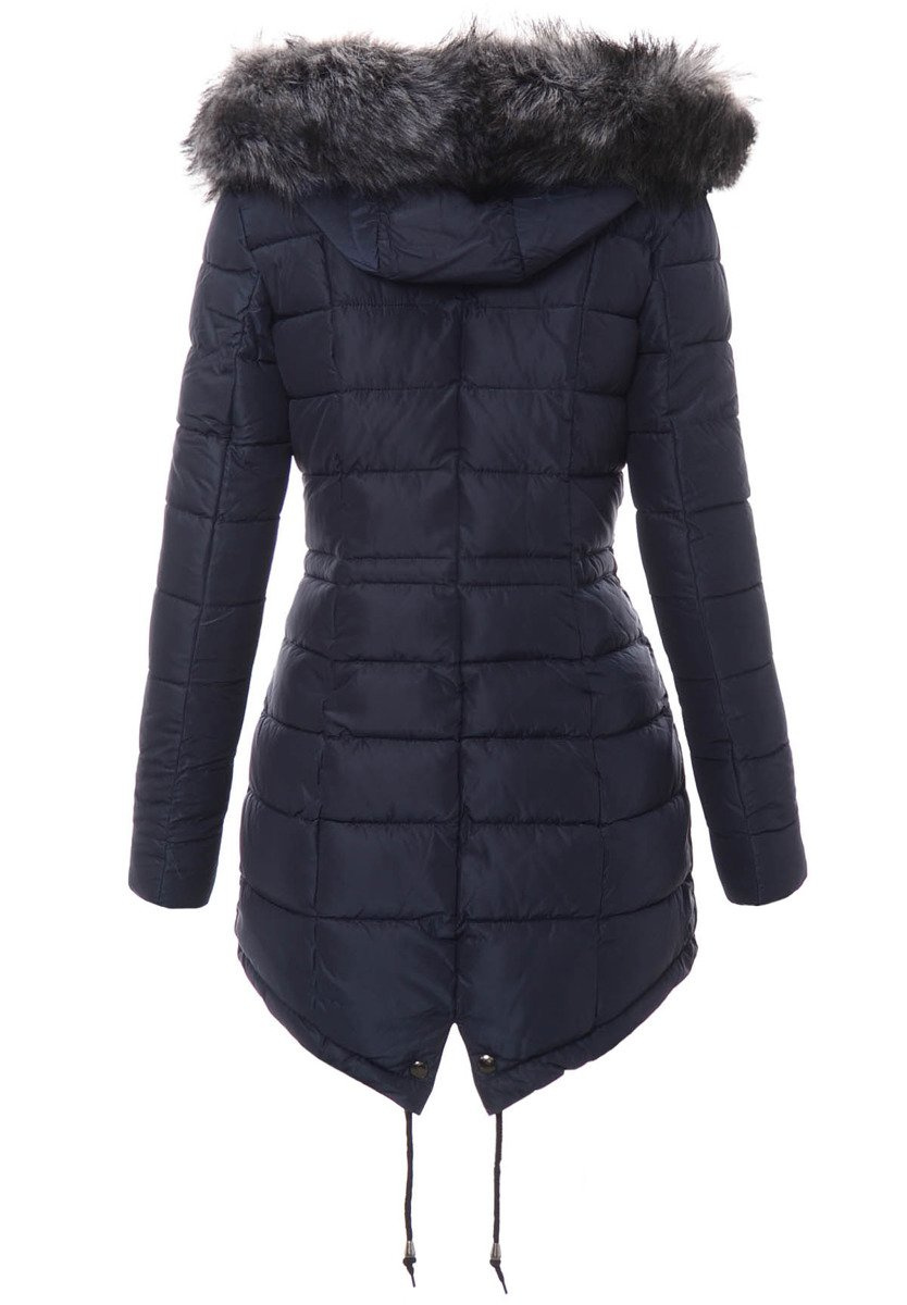 Rewelacyjna damska parka. Kolor granatowy. Kurtka ocieplona wykończona podszewką. Rękawy są ocieplone wykończone materiałem. Zapinana na suwak i zatrzaski. Ściągacze na w pasie i na dole. Nieodpinany kaptur. Odpinane futerko przy kapturze i wzdłuż suwaka. Dwie kieszenie z przodu zapinane na zatrzaski. Tył dłuższy o około 9 cm. Materiał wierzchni 100% poliester.