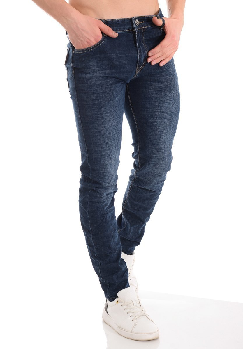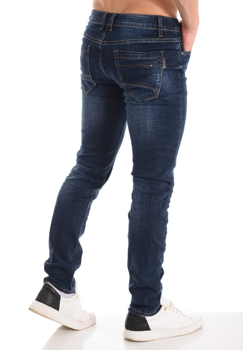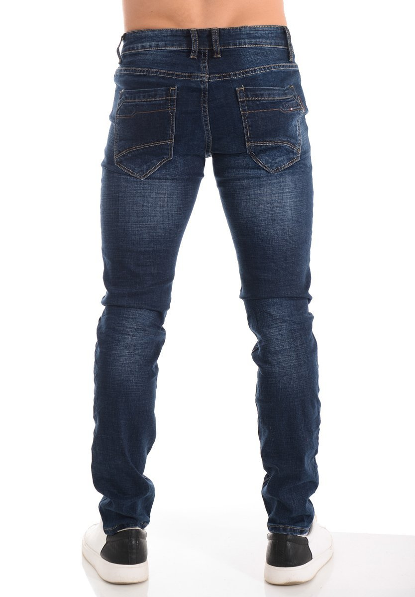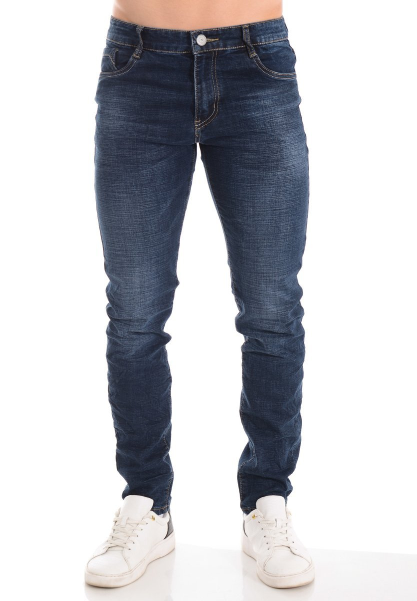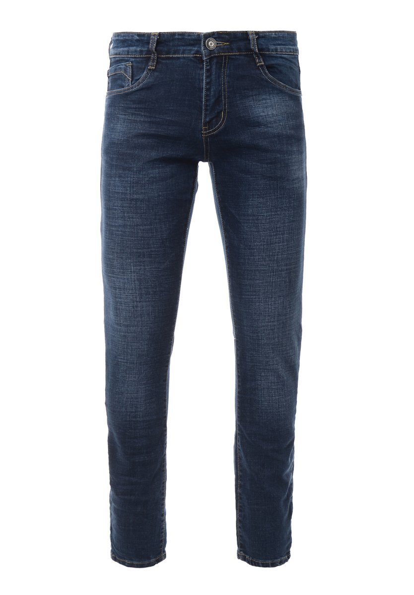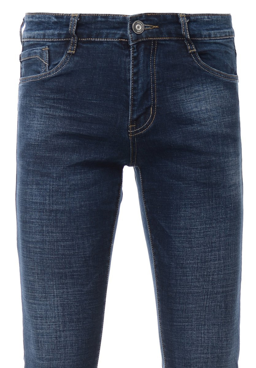 Męskie spodnie w kolorze granatowym. Jeansy zapinane na suwak oraz guzik. Szlufki w pasie. Spodnie mają trzy kieszenie z przodu i dwie z tyłu. Wykonane z materiałów najwyższej jakości. Materiał: 70% Bawełna, 28% Poliester, 2% Elastan.